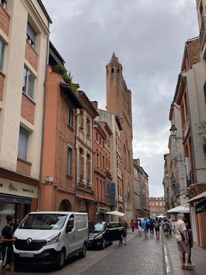 Tuesday morning we left our moorings just before the Malpas tunnel a little after 9 am. We found a good spot along the bank just before Capestang so we could make a quick trip to the nearby grocery store and, after squeezing under one of the lowest bridges on the canal, made our stop for the night in a shady spot about 4 k further on. Wednesday morning we put the bicycles over the side and made a quick trip back to town to visit the market (we bumped into John and Gill from Millie there) and the Saint-Etienne Collegiate Church, built beginning in the 13th century by the archbishop of Narbonne on the site of an old Romanic church. Never really completed, construction stopped and started for over 200 years.